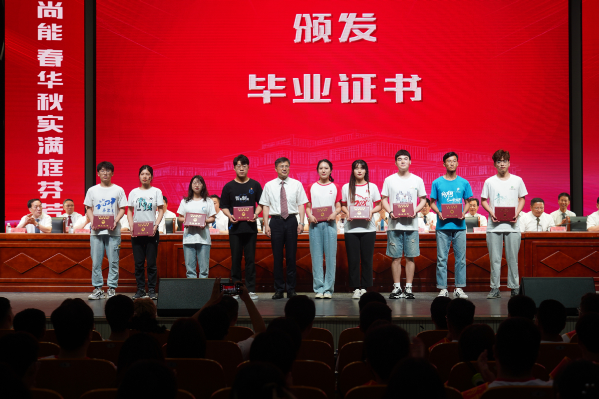 6月19日上午,我校隆重举行2021届毕业典礼,院长沈士德教授,党委副书记梁惠,纪委书记魏勇,副院长曾凡远、刘海波、蒋兆峰出席典礼。典礼由党委副书记梁惠主持。 典礼在《有一种时光,叫你们》的暖场视频中拉开帷幕。沈士德致辞并为省级优秀毕业生、校级优秀毕业生代表颁发荣誉证书。沈士德在致辞中代表学校党政对4395名2021届毕业生圆满完成学业表示热烈祝贺,并为全体毕业生送上寄语。他希望广大毕业生一是要坚定理想信念,热爱伟大祖国;二是要厚筑道德底蕴,锤炼品德修养;三是要苦练技能本领,肩负责任前行。以青春之我、奋斗之我,努力做社会主义事业的合格建设者和可靠接班人,创造属于自己的人生精彩。 魏勇宣读《关于准予2021届4395名学生毕(结)业的决定》。曾凡远为毕业生代表颁发毕业证书。刘海波为留学生代表颁发毕业证书。蒋兆峰宣读《省教育厅共青团江苏省委关于表彰2021年度江苏省普通高校省级优秀毕业生的决定》《江苏建筑职业技术学院关于表彰2021届优秀毕业生的决定》。 建筑建造学院辅导员李锐、智能制造学院机电18-1班鹿富强同学先后作为教师代表、毕业生代表发言。由武荣权等老师带来的诗朗诵《启程》,震撼了现场的每一位毕业生。10位由毕业生评选出的“心中的恩师”接受毕业生敬献的鲜花。 典礼尾声,师生快闪《凤凰花开的路口》《后来》,将典礼氛围推向高潮。典礼在毕业生响彻全场的宣誓声中结束,全体领导在主席台挥手送别毕业生离场,扬帆远航。 本次毕业典礼以线上线下相结合的形式举行,相关职能部门负责人、各学院党政负责人和毕业生代表在现场参加典礼,全体专兼职辅导员和其余2021届毕业生在各自班级通过直播的方式收看。